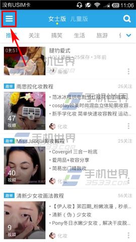 1)打开【蛙趣视频】,进入首页点击左上角的【三】按钮。(如下图)