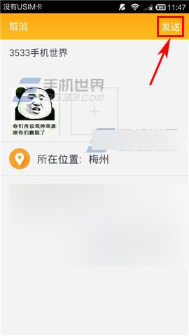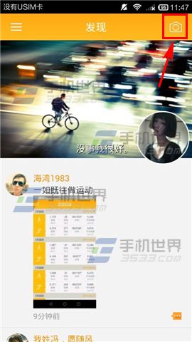 2)跳转到发现页面后,点击右上角的【照相机】按钮,输入文字描述和照片后点击【发送】即可。(如下图)