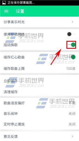 2)点击功能列表中的【设置】,在设置页中点击开启摇动换歌【开关】至绿色即可。(如下图)