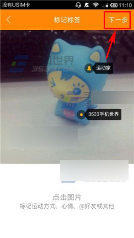 3)点击照片进行添加标签,标记运动方式、心情、@好友或者其他都可以~编辑好点击【下一步】,最后一步输入文字描述点击【发布】即可。(如下图)