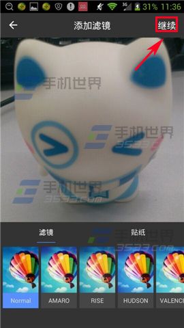 2)自动跳转拍照界面,点击中间【○】拍照,拍好照片后添加滤镜和贴纸,添加完成后点击右上角【继续】。(如下图)