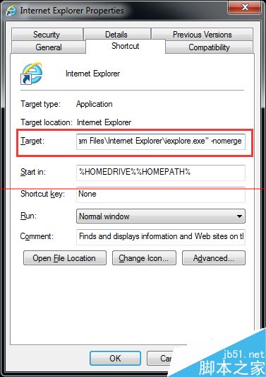 3、在”目标“栏中,增加”-nomerge“参数,并点确认按钮,如图: