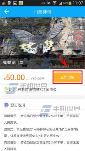 2)进入门票详情后点击【立即抢购】。接着选择套餐后点击【预订】。(如下图)