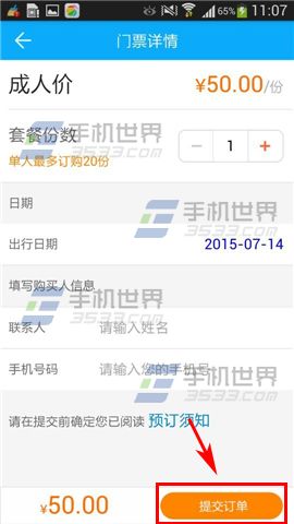 3)选择【日期】,进入确认订单页,填写购票信息后点击【提交订单】。进入支付页根据提示支付即可。(如下图)