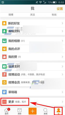 1)打开手机微博,在【我】栏选择【更多】;(如下图)