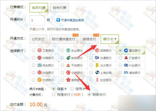 2、月份选择 1个月,点击银行卡支付“储蓄卡 - 网银支付”