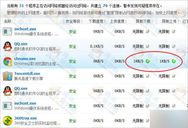 3、限制浏览器的上传和下载速度为“1”【360卫士、金山卫士、QQ管家都带“流量监控”功能】