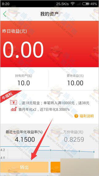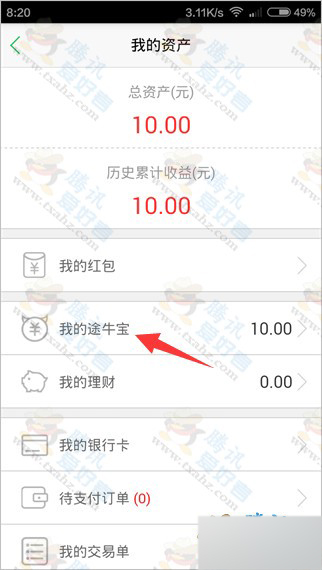 2、再点击“我的途牛宝”即可看到资产有10元,点击“转出”便可。