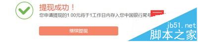 7、显示提现成功,大约一个工作日内就可以提现到你的银行卡。