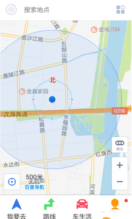 在地图模式下,导航会为我们自动定位当前位置,点击下边工具栏里面的“线路”。