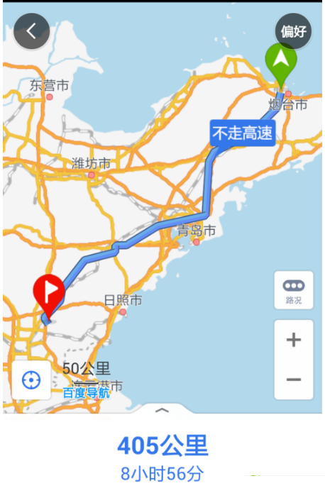 我们重新按照起点、终点规划一下线路,可以看到已经是“不走高速”模式了。
