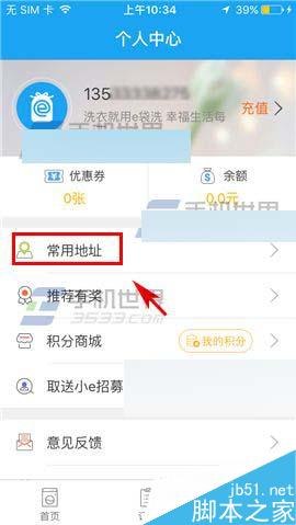 1)打开e袋洗软件后点击下方导航栏【个人中心】,接着点击【常用地址】。(如下图)