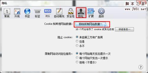 弹出对话框,切换到隐私项,点击“移除所有网站数据”