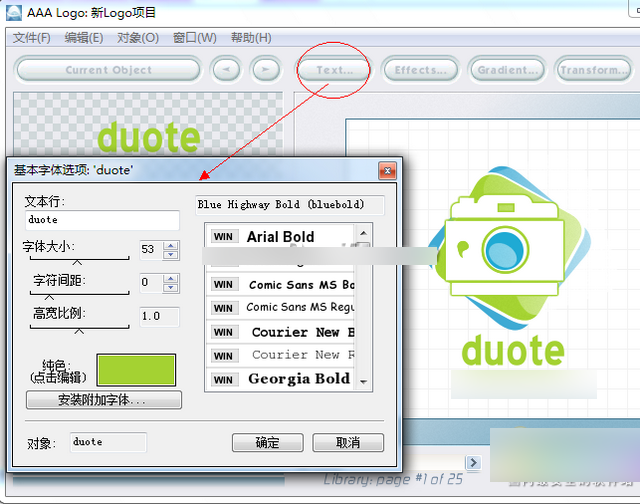 在此我们可以改变文本的内容,比如:duote.com当然我们也可以改变一下字体,这里的字体倒是挺多的,找一个你比较喜欢的,选中。然后就是字体的 大小、字符间距和高宽比例,这个你自己可以试试,操作区域会马上显示出效果,最后点击【确定】完成文本的操作。