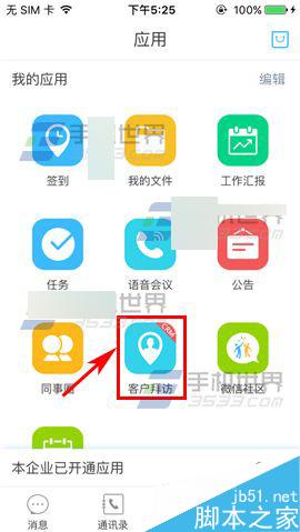 1)打开云之家,点击下方的【应用】,接着点击【客户拜访】;(如下图)