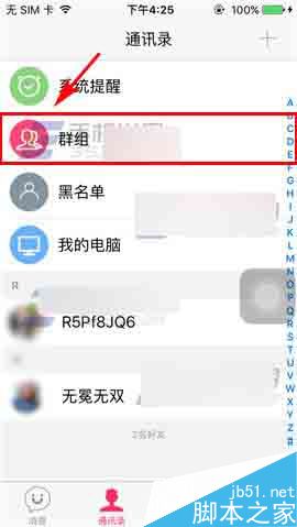 1)打开U聊,点击下方的【通讯录】,接着点击【群组】;(如下图)