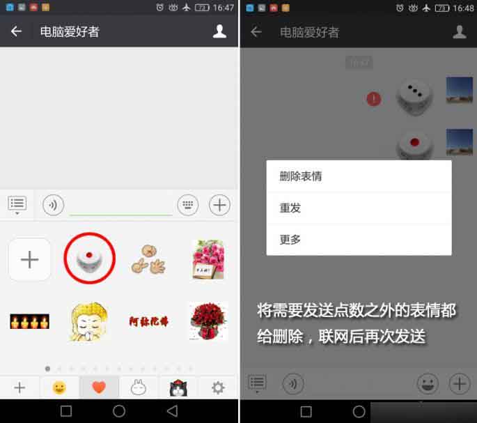 假装礼让对方先投,一旦发现对方不是6点,那么你作弊的机会就来啦:打开飞行模式(其实就是断网),然后疯狂点击骰子直至出现大于对方的点数,等所有骰子消息出现未发出的红色感叹号符号,这时关闭飞行模式,把点数最大的那个骰子消息重发一次就OK啦!等等小编,你确认这是一句话技巧?确认!这是一句复合句……