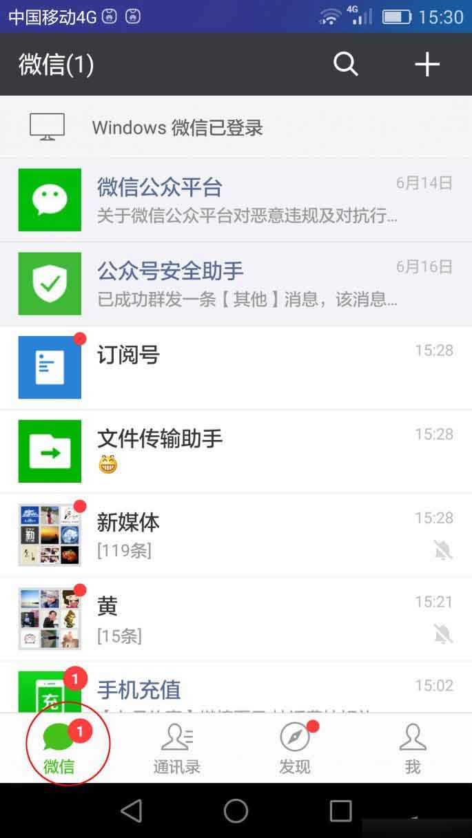 双击“微信”可至顶端或者未读信息