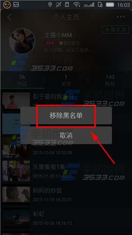 2)然后点击箭头所指的【。..】符号,点击【移除黑名单】就可以啦。(如下图)