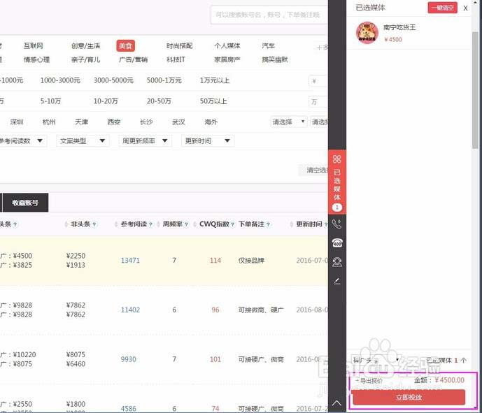 3、选中其中一个或者多个媒体,右侧购物车就会出现当前选中的媒体,单击购物车底部的“立即投放”按钮,进入下一步添加文案。