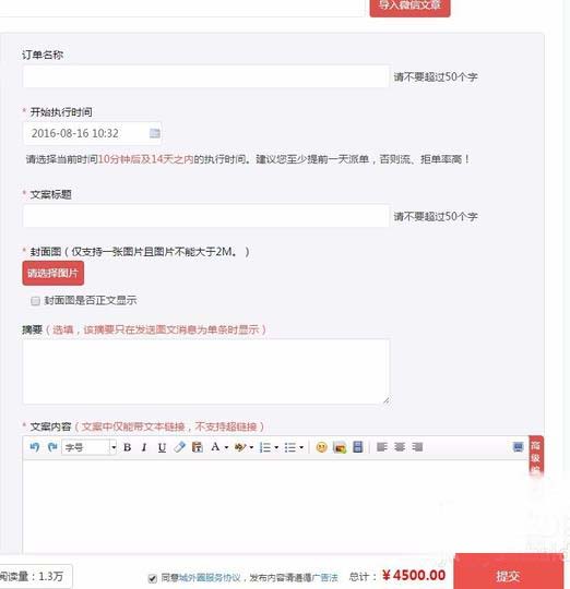 4、进入添加文案界面,需要用户把要推广的文案标题、正文内容等提交到系统,而且平台还能提供文案预览。文案预览没有问题,就选择底部的“提交”,进入正式下单冻结资金。