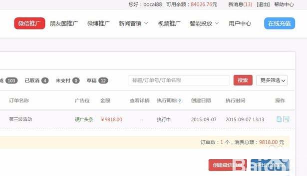 5、下单完成后,进入“用户中心”,查看刚才提交的订单,以及执行的情况,反馈数据。以微信公众号为例,3天后会提供媒体投放数据,包括阅读数、点赞数、转发数等数据截图,并可以批量下载。至此,系统完成整个下单流程,其他媒体下单雷同。