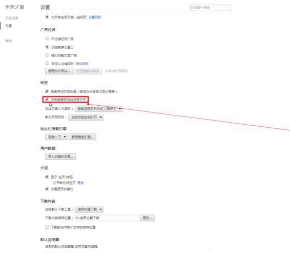 6、再打开标签页就可以自动跳转了,如果你想让他不自动跳转就把那个“点击链接在后台标签打开”前的勾打上!