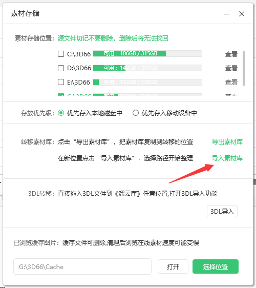 功能路径:设置--->素材存储--->导入素材库(注意:导入的素材库文件,必须是溜云库导出的素材库文件,否则无法正常识别导入的文件内容)