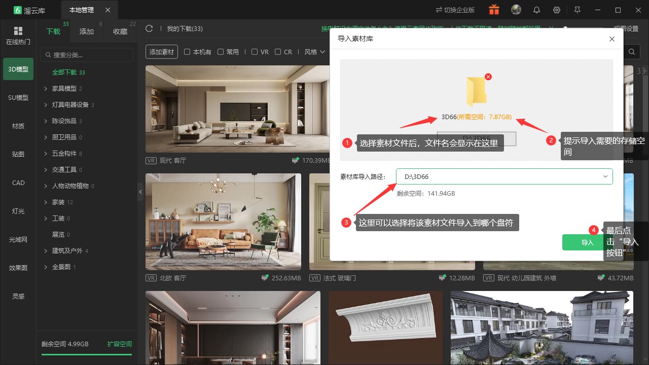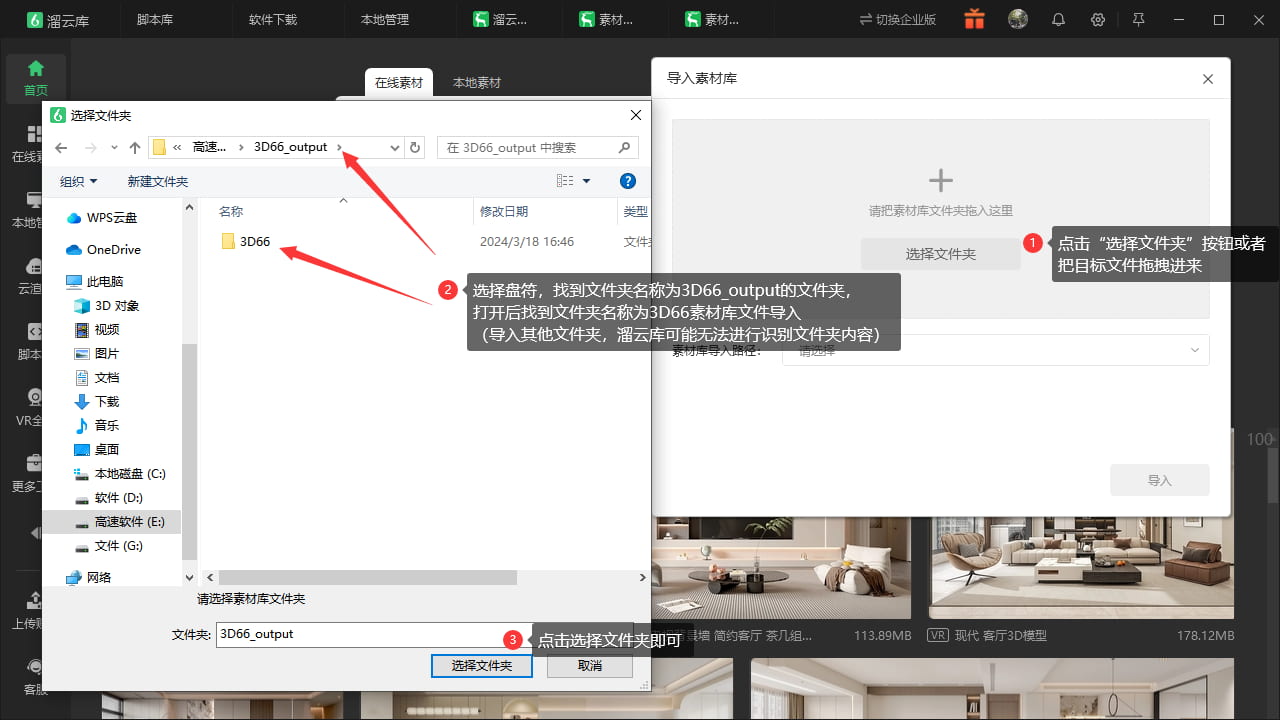 第二步:点击选择文件夹(也可以直接拖拽素材库文件到灰色区域进行选择)选择需要导入的3D66素材库文件,点击选择文件夹