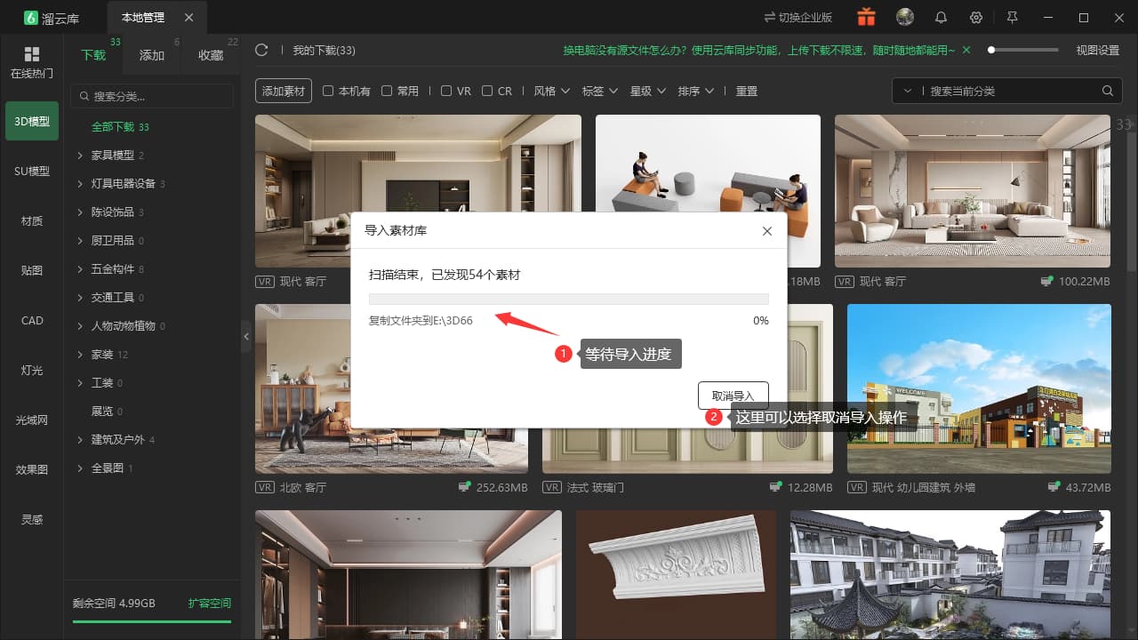 第一步:选择素材库(素材库定义:溜云库的素材存放文件)导入,会出现导入弹窗