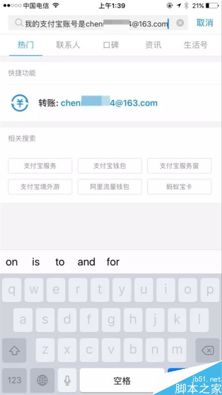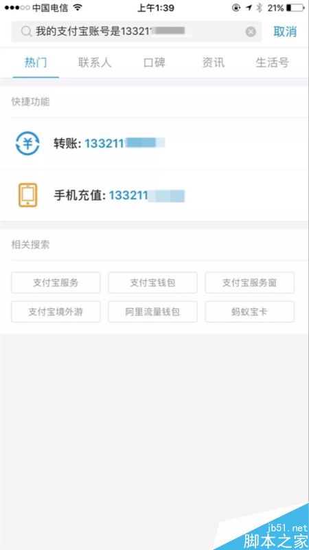 原来,最新版支付宝还有这样一项功能:只要把上面的文字复制到支付宝首页上的搜索框里,支付宝会帮你识别文字里的账号,就可以快速使用转账、充话费等功能啦。