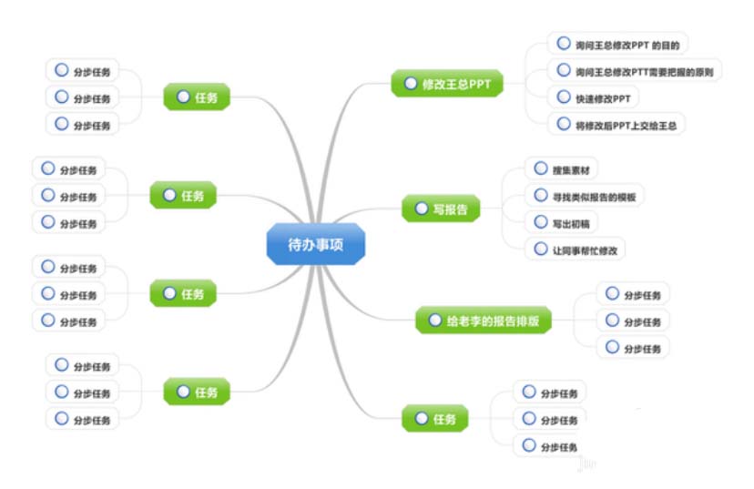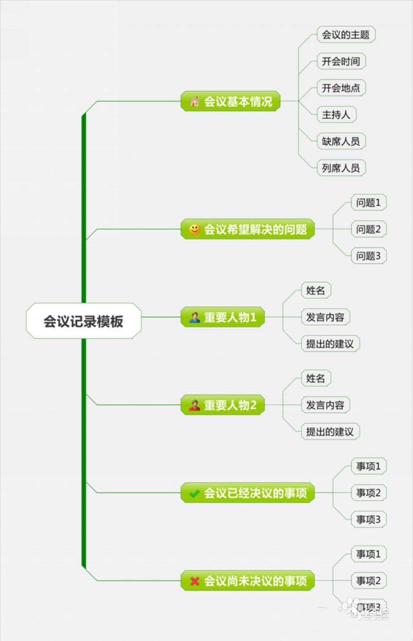 4、做一个会议纪要。结束一场会议,你肯定需要记录这场会议的精神,会议到底都讲了哪些事,用思维导图做会议纪要,会让同事和老板对你刮目相看。