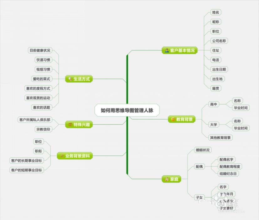 5、整理自己的人脉关系网。当你准备创业时,当你准备多认识朋友时候,除了你名片夹中的名片。还可以做一个人脉网络图谱,把关键的任务信息保存起来,一方面更全面的了解,另一方面可以更好的与其他人交往,发展!