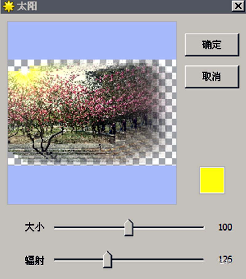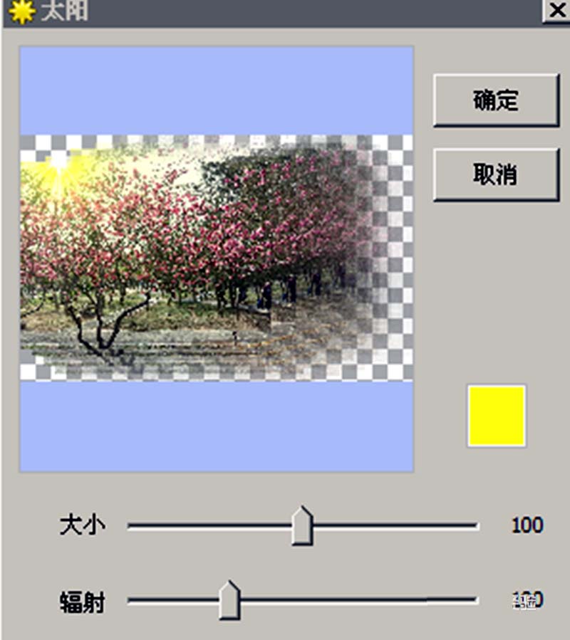 6、出现太阳调节框,在太阳调节框中调节大小和辐射,大小为100和辐射100。