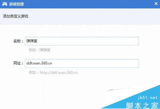 在游戏管理界面点击“添加游戏”然后再输入游戏名称和网址最后点击“确定”。