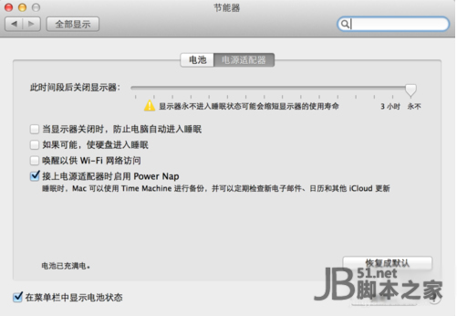 左击左上角的苹果图标,打开系统偏好设置,然后选择节能器,按照图片所示,关闭所有休眠选项