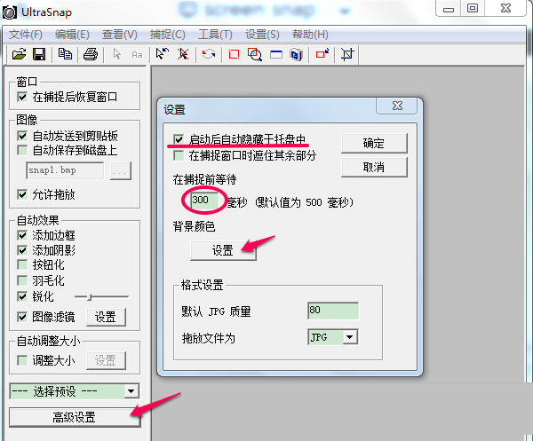 如下图所示,首先,点击“高级设置”;在弹出的设置框中将“启动后自动隐藏于托盘中”前面的方框勾选中;在下面的等待时间框中输入"300";如果自己对编辑图片的背景颜色不满意的话,点击箭头所示的”设置“,就可以选择调成自己喜欢的颜色了;最后点击右上方的确定即可。