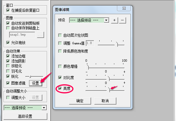 2、如下图所示,先勾选中大箭左边的“图像滤镜”;然后,点击大箭头所示的”设置“,在弹出的设置框中,选中“亮度”框,然后就可以调节亮度了。最后点击确定。