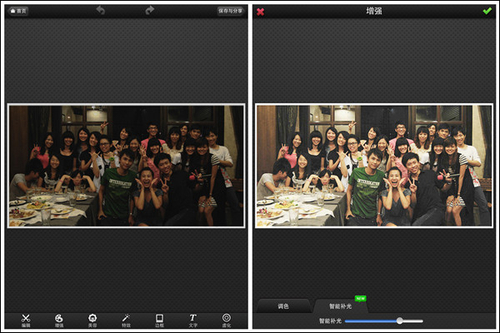 微博里大家还在吐槽“暑假这么快就结束了”!微博外,返校后同学室友的见面狂欢其实已冲淡了大家对暑假的依恋,只是聚会大多在室内,拍起照来真是不给力。不过,今年暑假虽已不可重来,可暗淡照片绝对可以补救,在刚更新的美图秀秀HD1.3.1版中,新增智能补光,只需一键拖动滑块,即可对照片进行智能整体补光,让你分享快乐毫无压力。