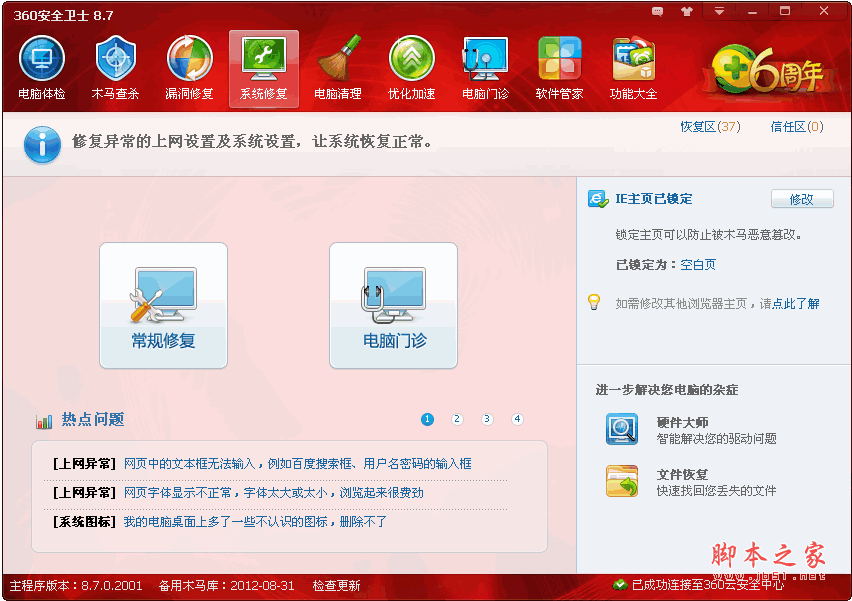 360主界面 系统修复 常规修复 扫描后 修复重启下电脑即可。