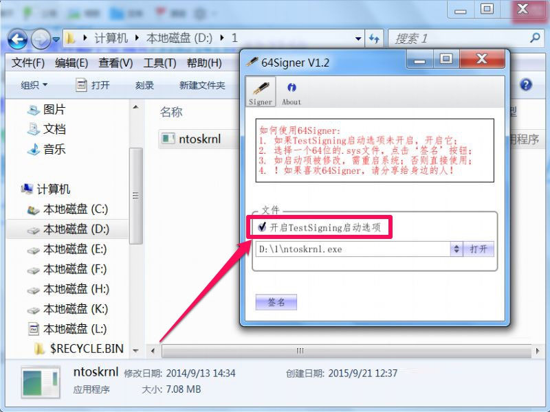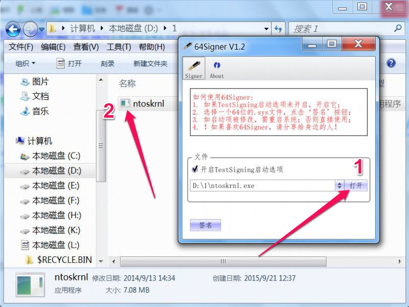 用64signer v1.2给驱动文件数字签名的方法步骤:
