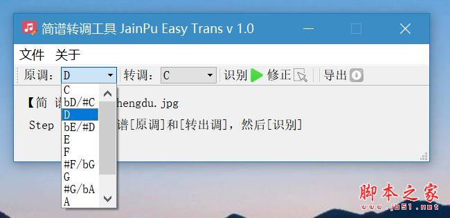 在下拉选项中设置“原调”与“转调”。设置好后,此时还不能导出转调后的结果 ,需要对原简谱进行识别。