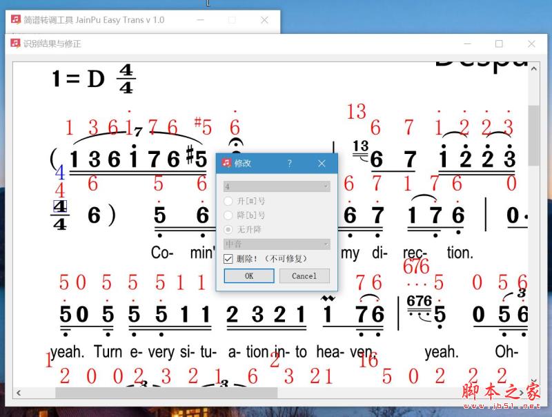 总结:此软件首先需要正确识别简谱中的音符,由于音符识别不能做到100 %的准确。因此采用人工辅助复查的方式,以保证转调前的音符识别结果是正确的。而音符转调过程完全交由系统自动完成。