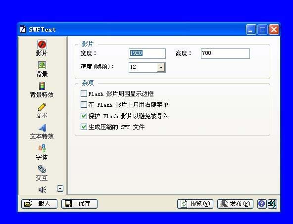 1、首先下载安装一个SWFTEXT软件,然后打开软件——点击影片,设置影片大小,我的背景图是1920X700,所以就设置了同背景图一样的大小。