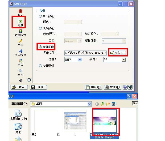 2、点击背景——选择背景图片——点击浏览,选择一张中秋的背景图——然后点击打开,也可以设置图片的位置:拉伸或平铺,