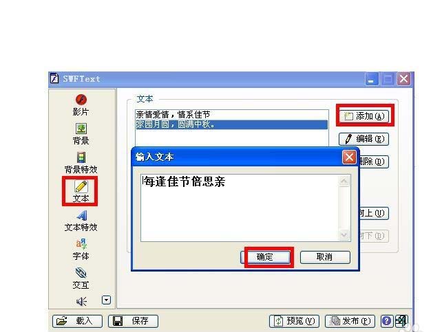 4、添加中秋贺词:点击文本——点击添加——在文本编辑中输入中秋贺词,然后点击确定。最好把一段祝福语分成几段贺词来添加。
