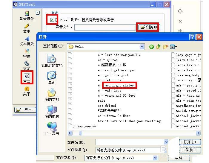 7、点击声音图标——勾选播放声音选项——点击浏览,然后选择一首和中秋有关的音乐——点击打开就添加音乐了,最后就可以点击预览,满意后就可以点击保存和发布了。