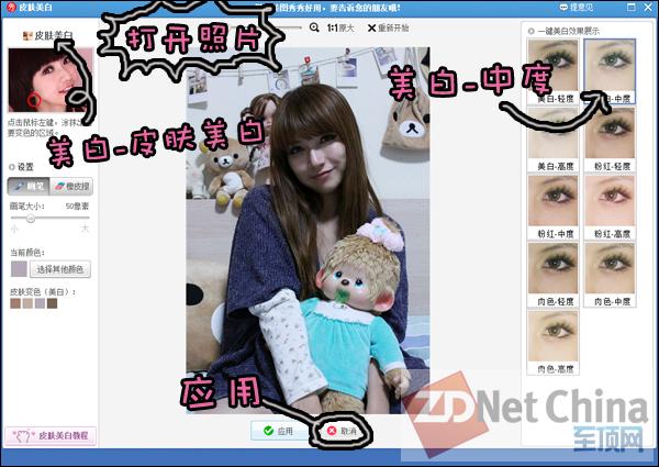 第一步:在“美图秀秀”软件下打开一张待处理的照片,进入“美容”菜单下,选择“皮肤美白”功能中的“美白—中度”,轻松一键改善黯淡问题。