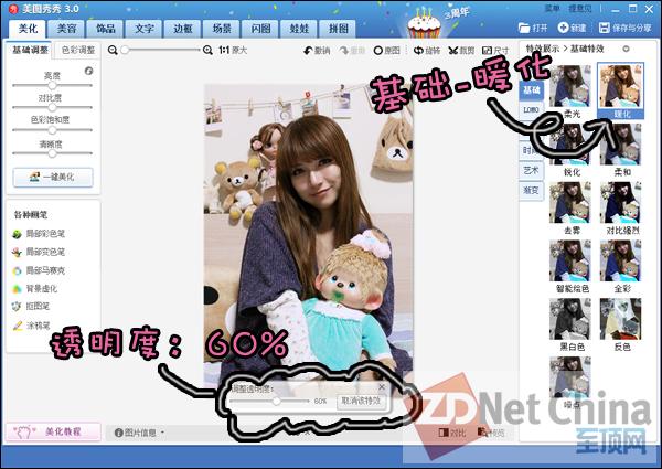 第二步:接着进入“美化”菜单下,选择“基础”分类下的“暖化”特效,并将特效透明度调至60%,适当调节透明度可以防止照片局部过爆。