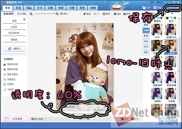 第三步:再选择“LOMO”分类下的透明度为60%“旧时光”特效,在进一步增强暖黄的色调的同时,为照片增添时尚流行的复古元素,最后点击保存,就大功告成啦!
